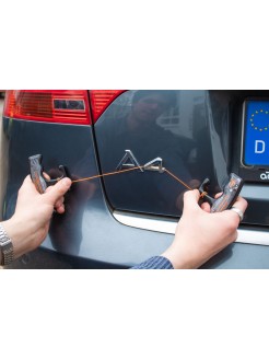 The ergonomic shape allows an easier removal of factory vehicle logos and type plates. The technical line is made of strongly rounded polymers, which prevent the vehicle paint from being scratched (unlike fishing lines or technical yarns, which are often used incorrectly and show their jagged polymers under the microscope, which can easily cause expensive damage to smooth surfaces).