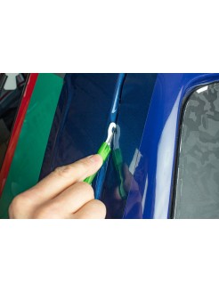 With WrapDefender, the risk of such damage is significantly reduced, as the extra-sharp scalpel blade is protected by the special shape of the cutting head - the plastic nose prevents the blade from going in too deep. For example, curves can be cut out to trim the film in the wheel arch without damaging the paint. This is particularly useful when applying paint protection films or doing full wrapping jobs.